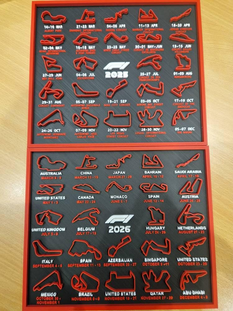 Celebrate the thrill of Formula 1 with this stunning wall art featuring the iconic circuits from the 2025 season! This meticulously crafted 3D display showcases all the tracks, from Silverstone to Monza, in order of race, with a vibrant and detailed design. Each track outline is precision-made and accompanied by its name and country, making it a perfect gift for F1 fans and motorsport enthusiasts. Ideal for your home, office, or as a centerpiece for your racing memorabilia collection, this artwork is a unique and stylish homage to the pinnacle of motorsport.